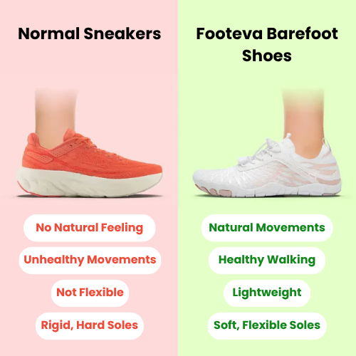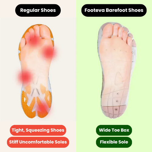 Are your feet hurting? Regular shoes are too stiff and cause pain in your feet, legs, and back. Footeva shoes fix this problem fast. Their thin, flexible soles let your feet move naturally.